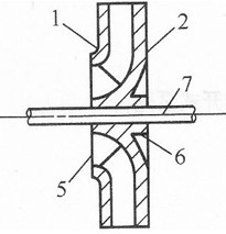 1一前蓋板;2一后蓋板;3一葉片;4葉槽; 1一吸人口;2一輪蓋;3一葉片5一吸水口;6一輪轂;7一泵軸 4一輪轂;5一軸孔